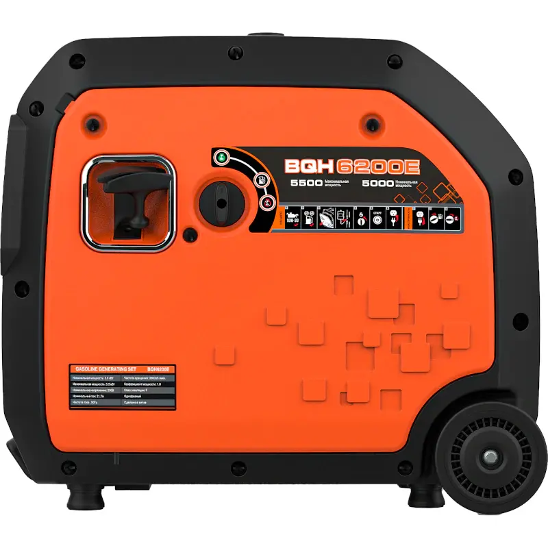 Бензиновый генератор Zongshen BQH 6200 E пригодится на стройплощадке, в частном доме или небольшом предприятии для организации автономного питания потребителей однофазным током. Если в центральной электросети пропадет напряжение, к двум розеткам на 16 А и 32 А можно подключать нагрузку общей номинальной мощностью 5 кВт, а к выходу постоянного тока — 12-вольтовые устройства или аккумуляторы. Бензогенератор с инвертором и блоком AVR снабжает устройства электроэнергией со стабильным напряжением. Для удобства перемещения электростанция оборудована колесами и выдвижной ручкой.