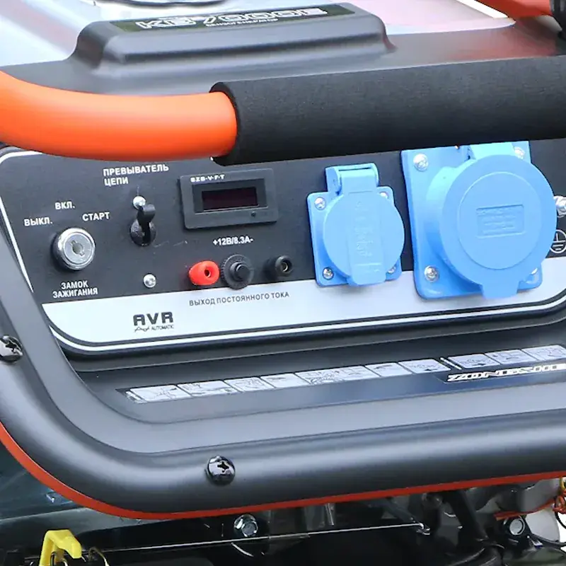 На панели управления расположены розетки для подключения однофазного оборудования. Например, бытовой техники на даче или электроинструмента в домашней мастерской. Один выход стандартный на 16 А, а другой силовой 32 А. Обе розетки оснащены защитными пластиковыми колпачками, которые не допускают попадания пыли и грязи внутрь.