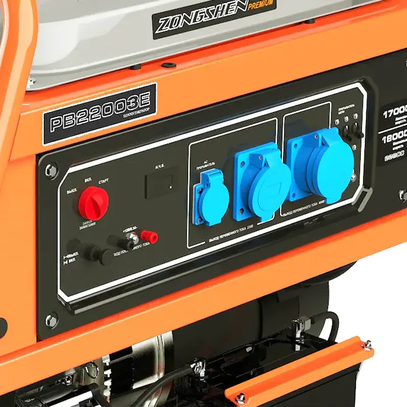 Бензиновый генератор Zongshen мощностью 18 кВт позволяет подключать как однофазные потребители общей мощностью до 4,53 кВт, так и трехфазные суммарной мощностью до 13,6 кВт. Для подключения приборов предусмотрено три розетки на лицевой панели. Стандартная розетка 220 В/16 А оптимальна для бытовой техники, осветительных приборов и маломощных инструментов. Розетка 220 В/32 А подходит для электроинструментов, электроплит, отопительных котлов большой мощности. Трехфазная розетка 380 В предназначена для силовой строительной и другой техники соответствующей фазности.
