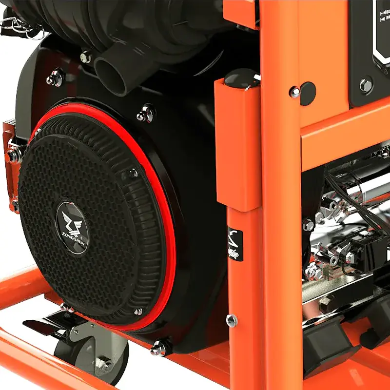 Генератор Zongshen PB 22003 E смонтирован на прочной металлической раме, которая защищает внутренние элементы от механических повреждений. Система гашения вибрации помогает снизить нагрузку на несущие узлы агрегата и продлить срок его службы. Несмотря на большой вес генератора – 227 кг, перемешать его не сложно. Для этого на раме предусмотрено 4 колеса и складная ручка. Предотвратить поломки двигателя помогает система контроля за уровнем масла. При его снижении до критической отметки цепь зажигания разомкнется и мотор остановится.