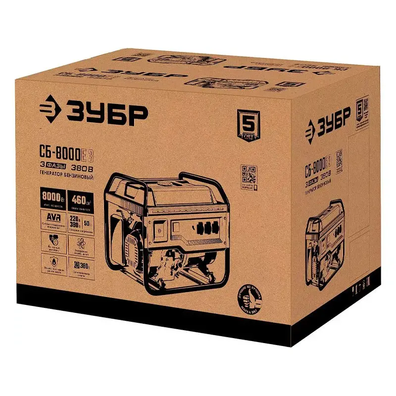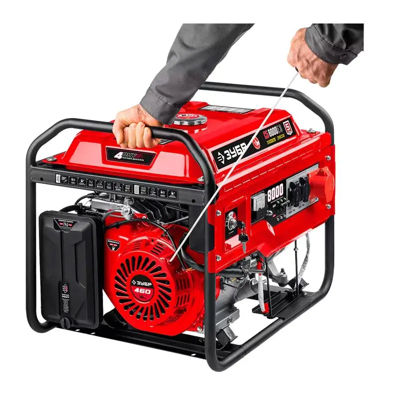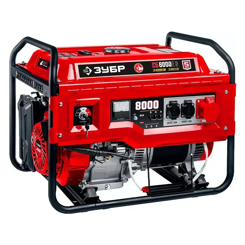Бензиновый электрогенератор ЗУБР СБ-8000Е-3, предназначен для обеспечения электрической энергией потребителей в отсутствии электрической сети, а также для использования в качестве резервного или аварийного источника электрической энергии. Оптимальный по мощности генератор с возможностью подключения трехфазного потребителя электроэнергии.