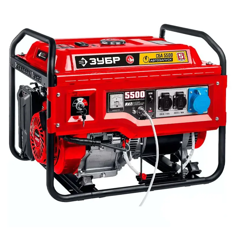 Бензиновый электрогенератор ЗУБР СБА-5500, предназначен для обеспечения электрической энергией потребителей в отсутствии электрической сети, а также для использования в качестве резервного или аварийного источника электрической энергии. Мощный генератор, который пригодится не только в загородном доме, но и в мастерской, и на строительной площадке, и вообще везде, где нет стационарного электричества, но нужно иметь работающий приборы и инструмент.